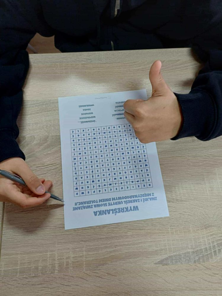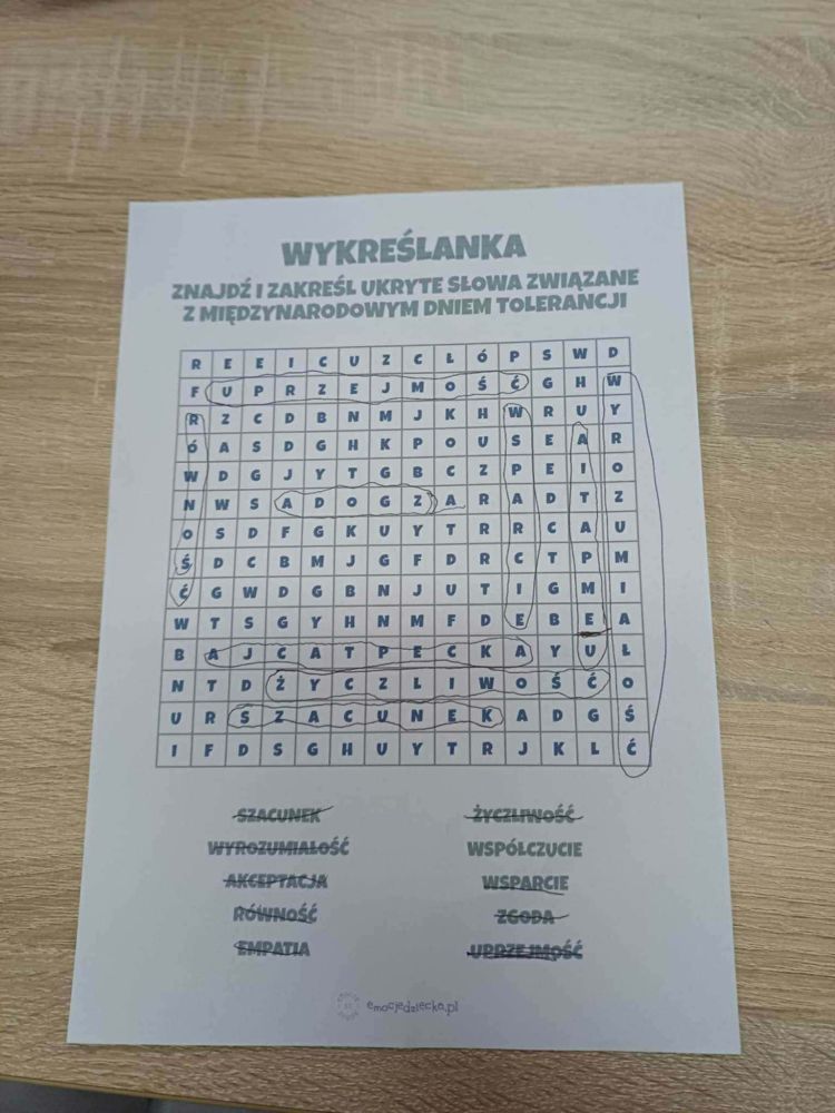 Międzynarodowy Dzień Tolerancji w naszej szkole 16 listopada to Międzynarodowy Dzień Tolerancji, z tej okazji psycholog i pedagog specjalny przygotowali dla uczniów działania, których celem było promowanie szacunku, empatii i otwartości na różnorodność. Zajęcia z uczniami obejmowały rozmowy o akceptacji, współpracy i reagowaniu na wykluczenie. Podczas zajęć wykorzystaliśmy filmik edukacyjny, karty pracy, które pomogły uczniom: – zrozumieć, czym jest tolerancja; – zastanowić się nad własnymi postawami; – wspólnie wypracować sposoby budowania przyjaznej atmosfery w klasie; -współpracować w grupie; -pracować nad komunikacją interpersonalną. Karty pracy stały się inspiracją do ciekawych dyskusji i ćwiczeń w parach. Dziękujemy wszystkim za aktywny udział! Razem tworzymy szkołę, w której każdy jest ważny, widziany i akceptowany .