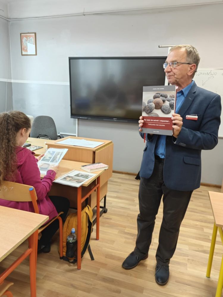 24 listopada uczniowie klas ósmych w ciekawy sposób pogłębiali swoją wiedzę historyczną. Tego dnia gościem na lekcjach historii był pan Janusz Czapiewski, wieloletni nauczyciel historii w SP5 oraz LO w Lipnie, a także członek Federacji Rodzin Katyńskich. Powodem zaproszenia pana Czapiewskiego na zajęcia jest właśnie jego członkostwo w Stowarzyszeniu "Rodziny Katyńskie", którego celem jest upamiętnienie ofiar zbrodni dokonanej na polskich żołnierzach oraz przedstawicielach innych służb przedwojennej Rzeczypospolitej przez sowieckie NKWD. Pan Janusz opowiadał ósmoklasistom o tym, jak doszło do zbrodni na Polakach, wśród których był także członek jego rodziny oraz co kryje się pod wyrażeniem "kłamstwo katyńskie". Pan Czapiewski posiłkował się przy tym licznymi materiałami Instytutu Pamięci Narodowej oraz przykładami literatury, która ukazała się na omawiany temat. Pan Janusz wskazał na znaczenie upamiętnienia ofiar zbrodni katyńskiej i miejsc, w których Polacy byli przetrzymywani i mordowani. Mówił, że takie miejsca, jak Katyń, Kozielsk, Starobielsk, Ostaszków, Bykownia czy Charków nigdy przez Polaków nie powinny być zapomniane. Uczniowie z zainteresowaniem wysłuchali prelekcji. Dziękujemy bardzo za ciekawe spotkanie.
