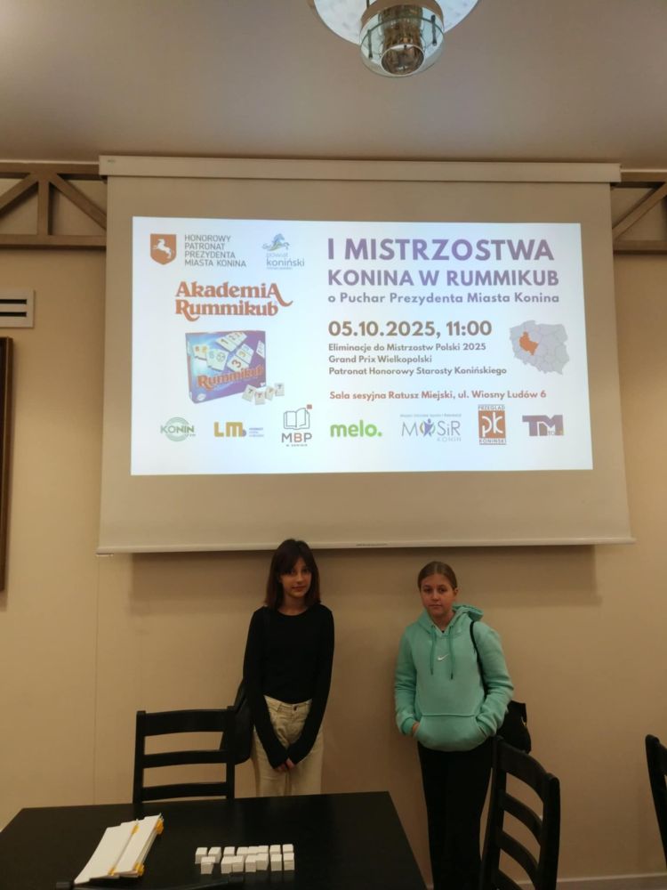 Zaznaczyliśmy swój udział w rozgrywkach Rummikub w Koninie To już drugie ogólnopolskie rozgrywki gry Rummikub, w których wzięły udział uczennice klasy Va: Agata Rakowska i Zosia Kalinowska. Dziewczęta pokazały swoje umiejętności 5 października w I Mistrzostwach Rummikub, które odbyły się w Koninie. Choć uczennice nie stanęły na najwyższym podium to na pewno nie uznają czasu spędzonego przy stołach w sali konińskiego ratusza za stracony. Dzielnie stawiały czoła nawet mistrzom gry. A spacer po zmaganiach turniejowych przybliżył dziewczętom urocze miasto, jakim jest Konin. Podziękowania należą się Pani Jolancie Ladzińskiej - trenerce gry Rummikub, dzięki której wyprawa do Konina była możliwa.
